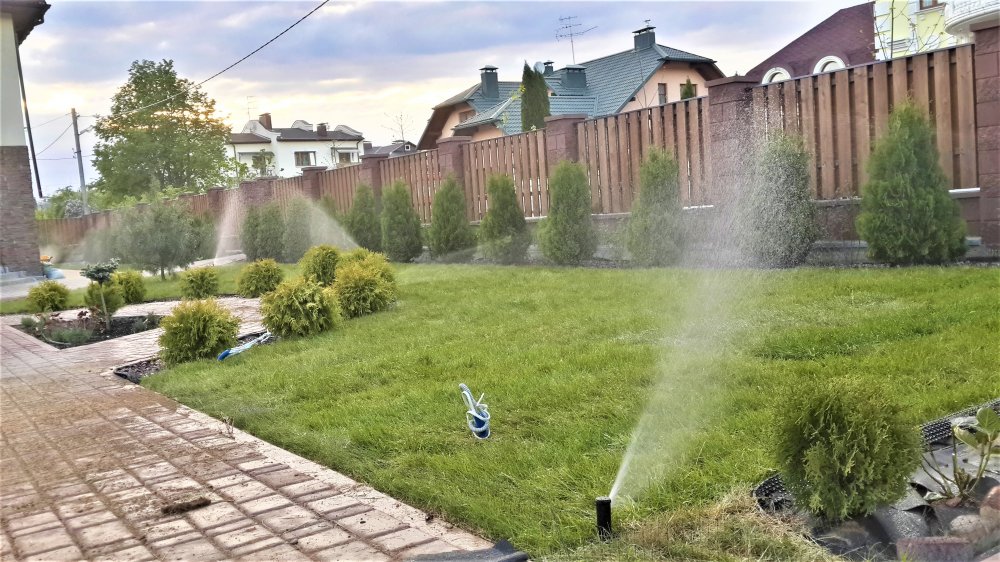 На данном участке было установлено 31 дождеватель, из них 19 роторных и 12 статических для орошения газона. А также было уложено 100 метров капельной трубки для полива цветников и живой изгороди. Было израсходовано 400 метров трубы диаметром 32 мм. Смонтировано 2 клапанных бокса, установлен контроллер и датчик дождя.