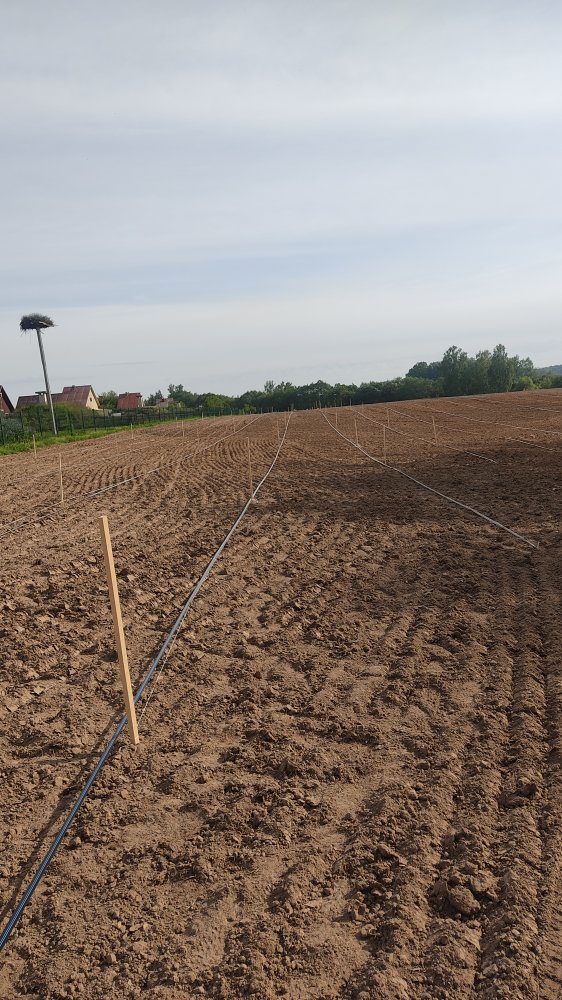 Монтаж системы капельного полива арбуза и дыни производился при организации новой плантации со схемой посадки 0,7 м х 2,8 м. Была выбрана капельная лента Aqua-Traxx (Toro) диметром 16 мм, толщина стенки 8 мил, расстояние между эмиттерами 20 см, водовылив 1,14 л/час. Укладка капельной ленты производилась под укрывочный материал. Латеральный и магистральный трубопроводы уложены в землю, чтобы не препятствовать работе обслуживающей техники. Вся площадь полива разбита на два контура. Запуск каждого контура осуществляется посредством шаровых кранов, для перекрытия каждой линии полива в стартовых точках также установлены краны. Для осуществления точной настройки системы предусмотрены манометры непосредственно на поле возле запорной арматуры, а также в помещении, где установлен насос.