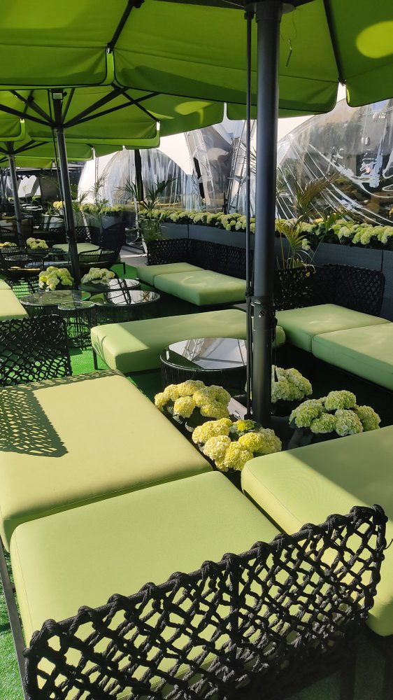 Система капельного полива на открытой террасе смонтирована максимально скрыто от глаз посетителей. Для каждого растения устанавливалась индивидуальная капельница, доставляющая воду непосредственно в прикорневую зону растения. В системе полива использовались компенсированные капельницы Clik Tif с расходом воды 2 литра в час. Трубопровод д.16 собран при помощи фитингов для капельной трубки Rain Bird. Подача воды осуществляется в ручную путем подключения шланга к быстросъемному соединению системы полива.