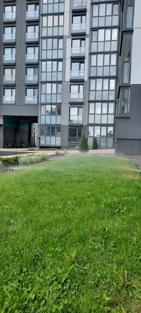 При составлении плана системы автоматического полива участок был разбит на 17 зон полива. Забор воды осуществляется из системы центрального водоснабжение через отдельный счетчик учета. Для дополнительной очистки воды установлен двухдюймовый дисковый фильтр. В проекте использованы форсунки ротаторного и статического типов. Управление системой происходит автоматически при помощи электромагнитных клапанов, установленных в боксах, контроллера полива и датчика дождя. Орошение происходит по заданной программе, при выпадении необходимого количества осадков естественным путем датчик дождя выключает полив.